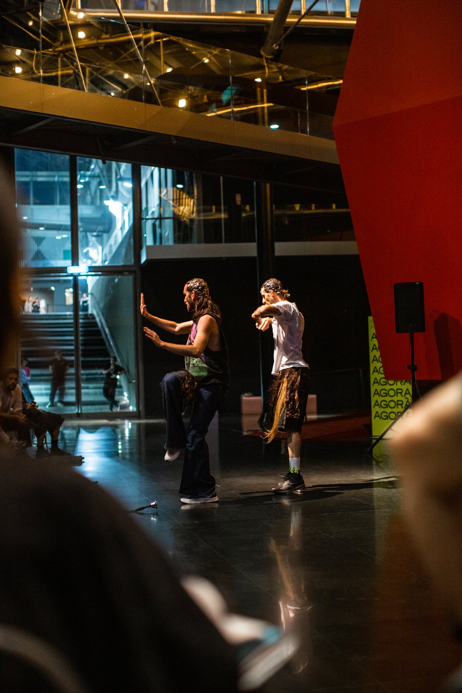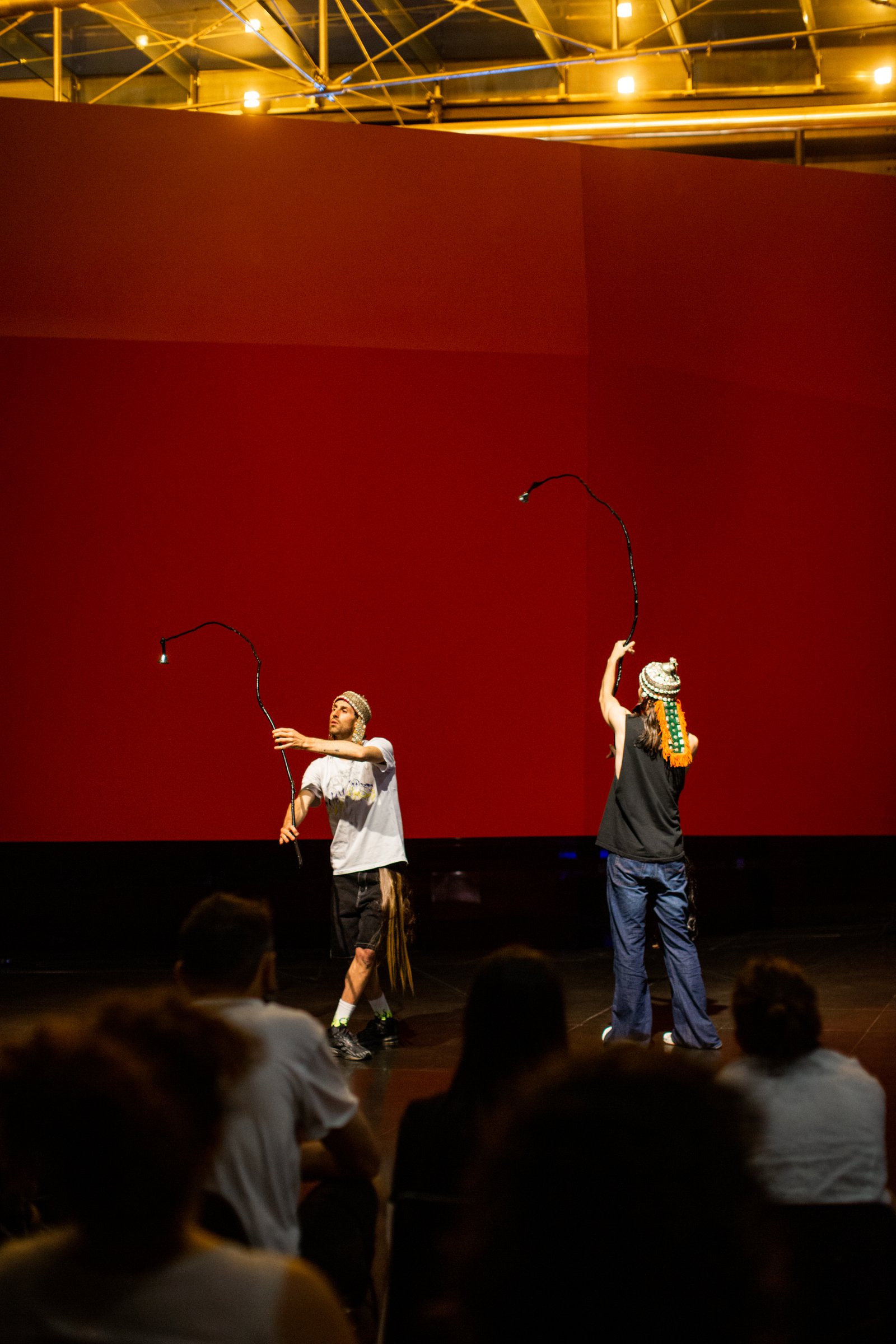 Fuego attiva un circuito di dinamiche e ritmi che si espandono attraverso vari moduli. Le azioni del corpo si intrecciano al suono, creando una composizione che, attraverso la ripetizione e la moltiplicazione di sequenze, dilata e contrae spazio e tempo. Questo formato coreografico e sonoro si nutre di un continuo divenire, declinando sviluppi, intenzioni e slanci in un flusso costante. Elementi sciamanici e ipnotici sono integrati per creare un’esperienza immersiva, influenzando movimenti e percezioni. Questa interazione tra corpo e suono evoca una trance collettiva, trascende la realtà quotidiana e invita a un viaggio interiore trasformativo.